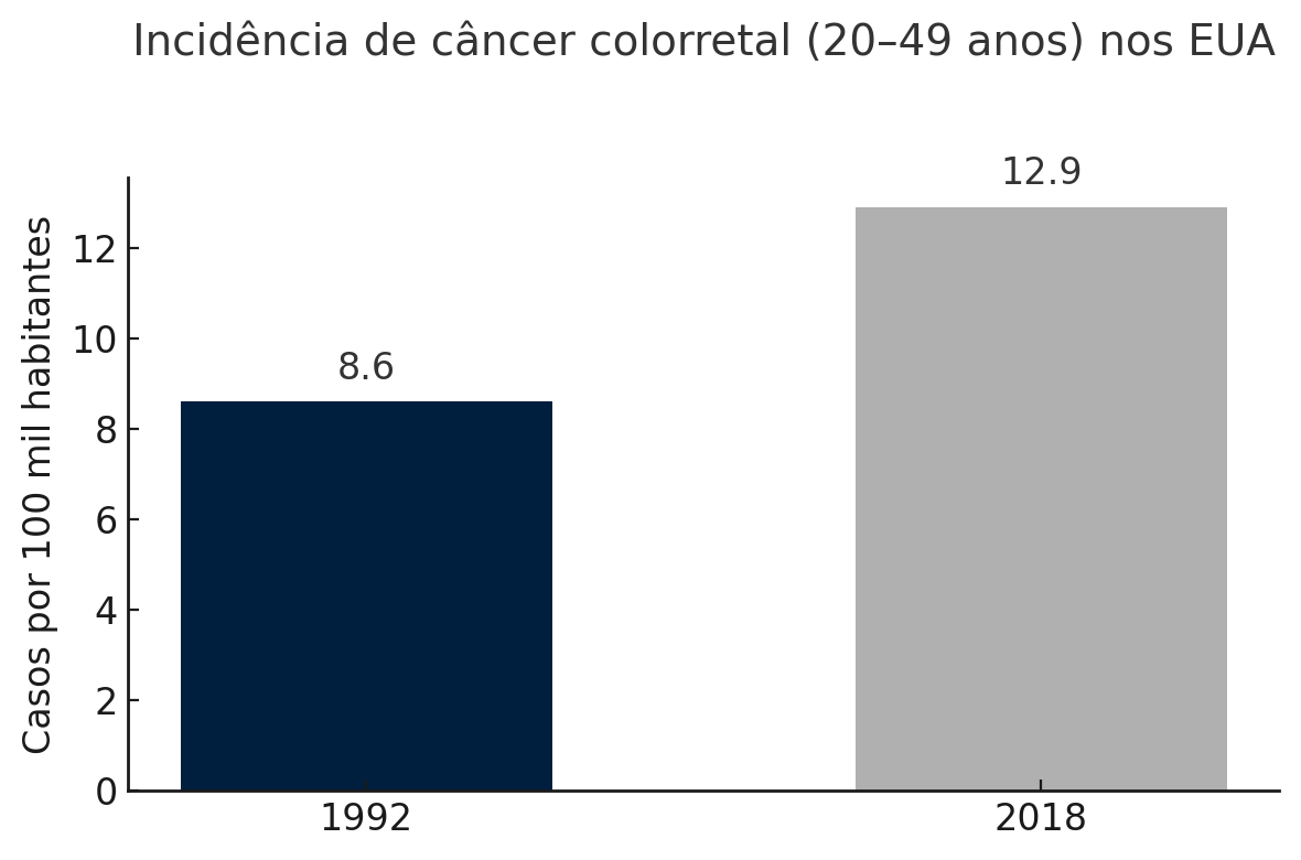 Por exemplo, nos Estados Unidos, de 1992 para 2018, houve um aumento de aproximadamente 50% nos casos de câncer colorretal entre jovens.